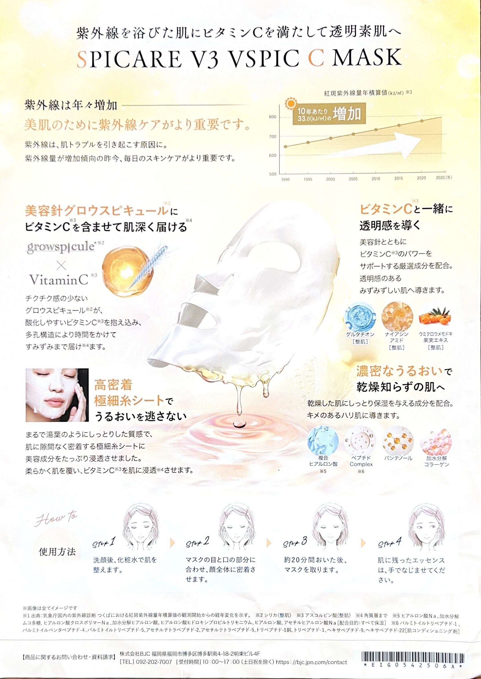 高純度のビタミンC※2を含んだ「グロウスピキュール」※1が肌のすみずみまで※3まで届き、透き通るような光彩肌へ。さらにナイアシンアミド(整肌)、グルタチオン(整肌)、7種のヒアルロン酸(保湿)を配合。高密着シートで効率的な保湿が叶います。洗顔後、お肌のキメを整えた後にお使いください。